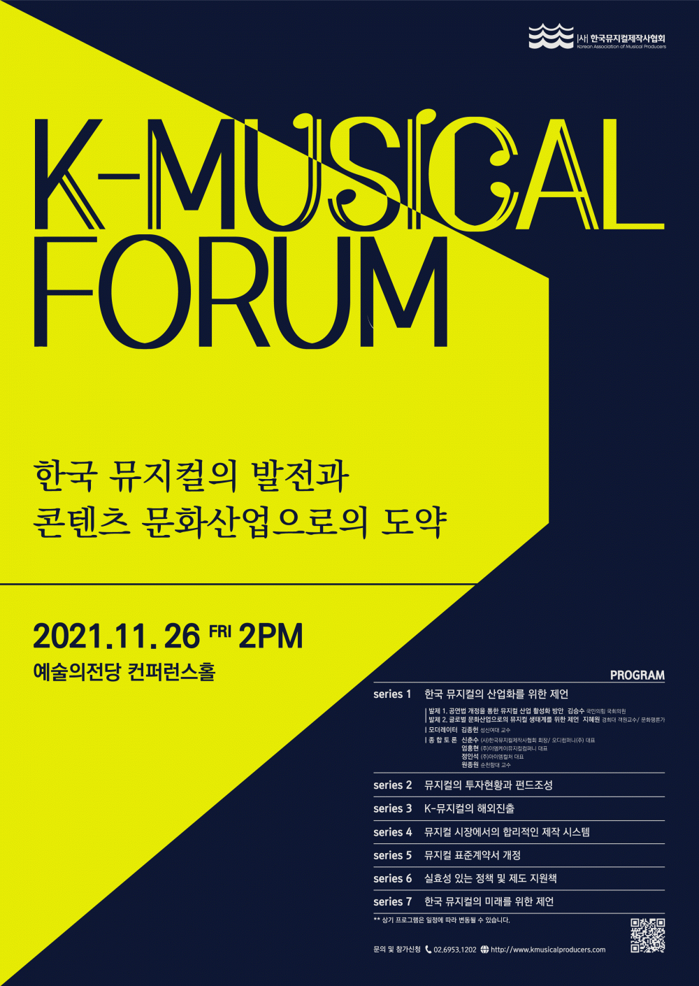 사단법인 한국뮤지컬제작사협회는 ‘한국뮤지컬의 발전과 콘텐츠 문화산업으로의 도약’을 대주제로 설정하고 ‘한국뮤지컬의 산업화를 위한 제언(소주제)’를 시작으로 출범식 직후 ‘K-Musical 포럼시리즈’를 개최하였습니다.